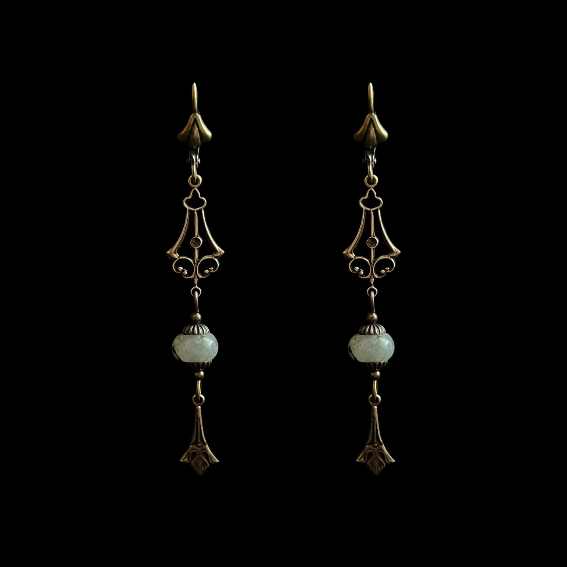 A necklace this ornate needs a matching set of earrings to accompany it. I designed the River Naiad Crystal Earrings with natural labradorite crystals, antique bronze fluted bead caps, ornate victorian charms and shell embossed leverbacks.