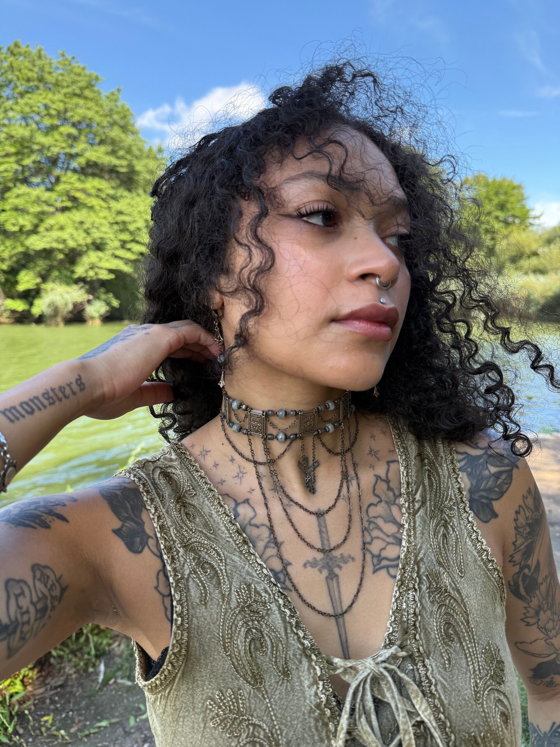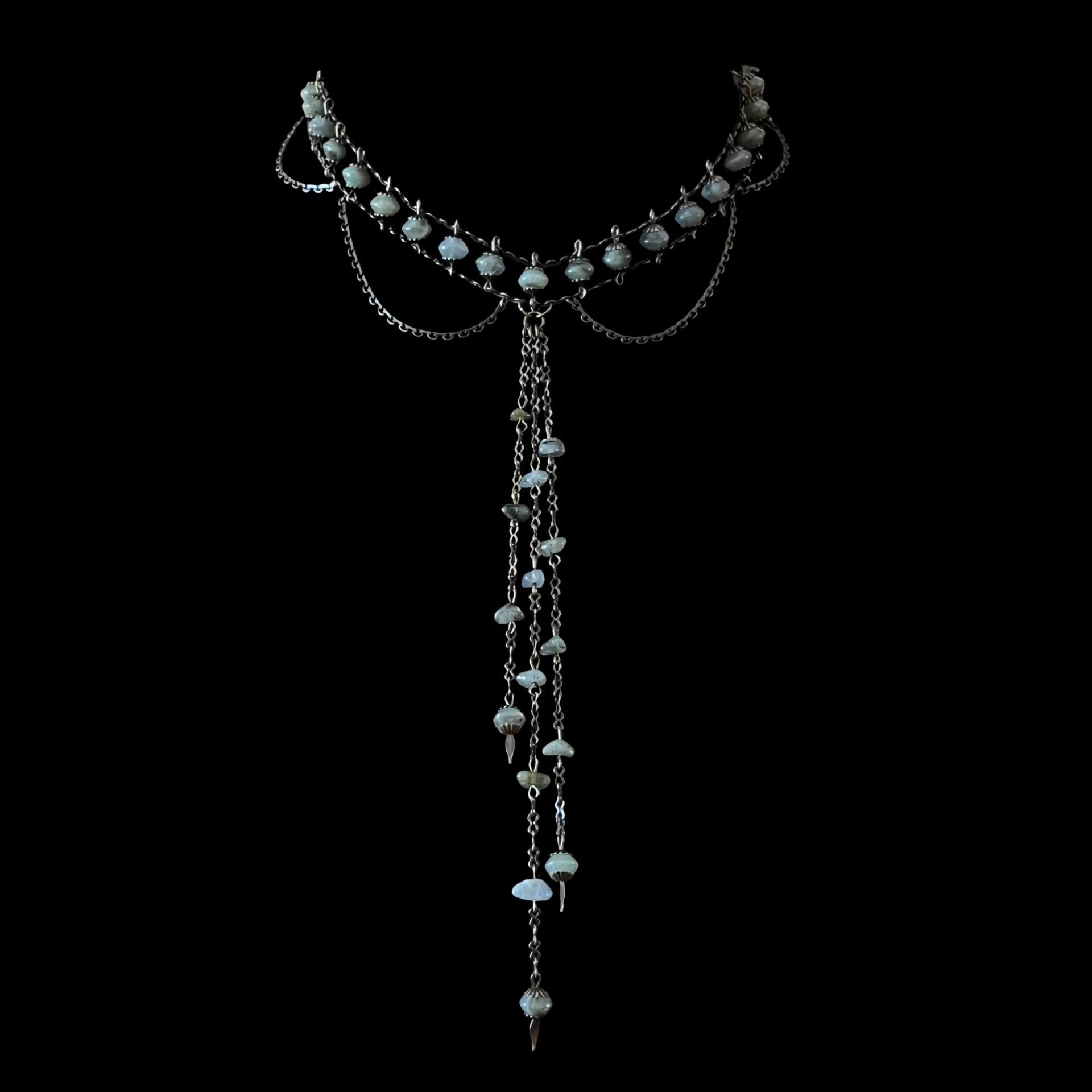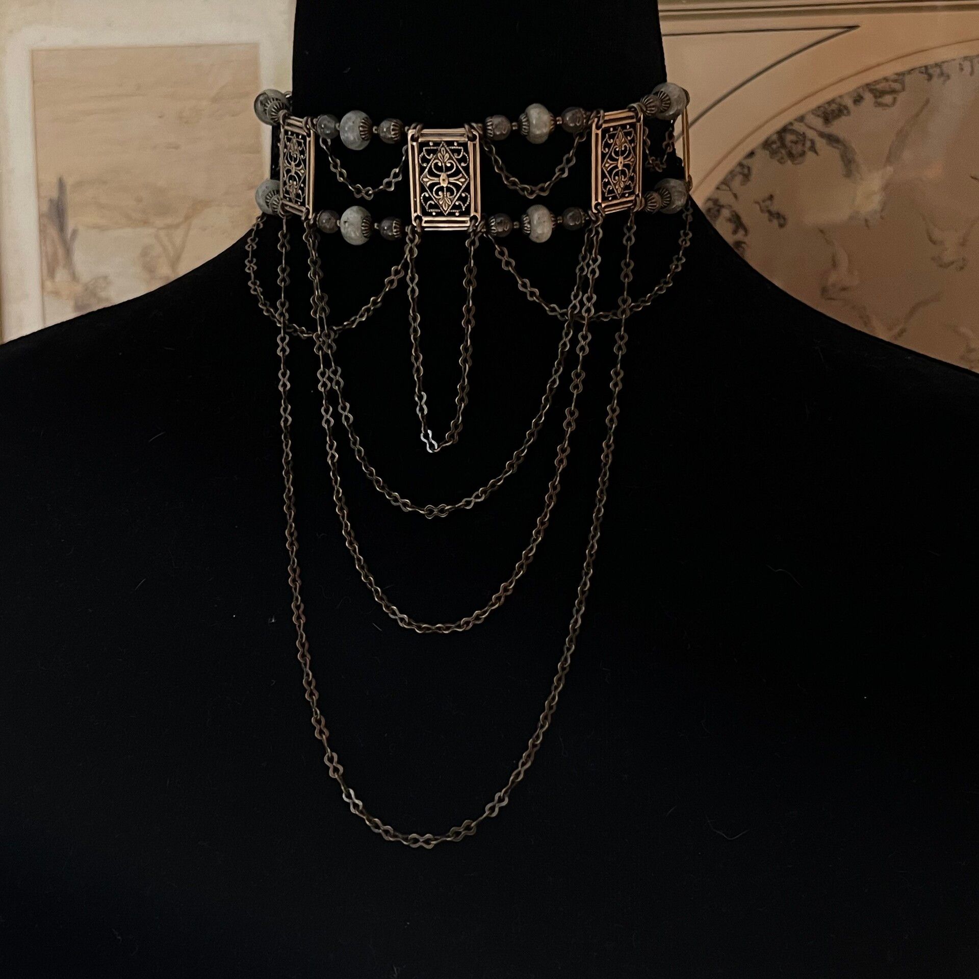 I designed the River Naiad Crystal Choker with natural labradorite crystals, victorian styled motifs, antique bronze fluted bead caps, and ornately draped chain.