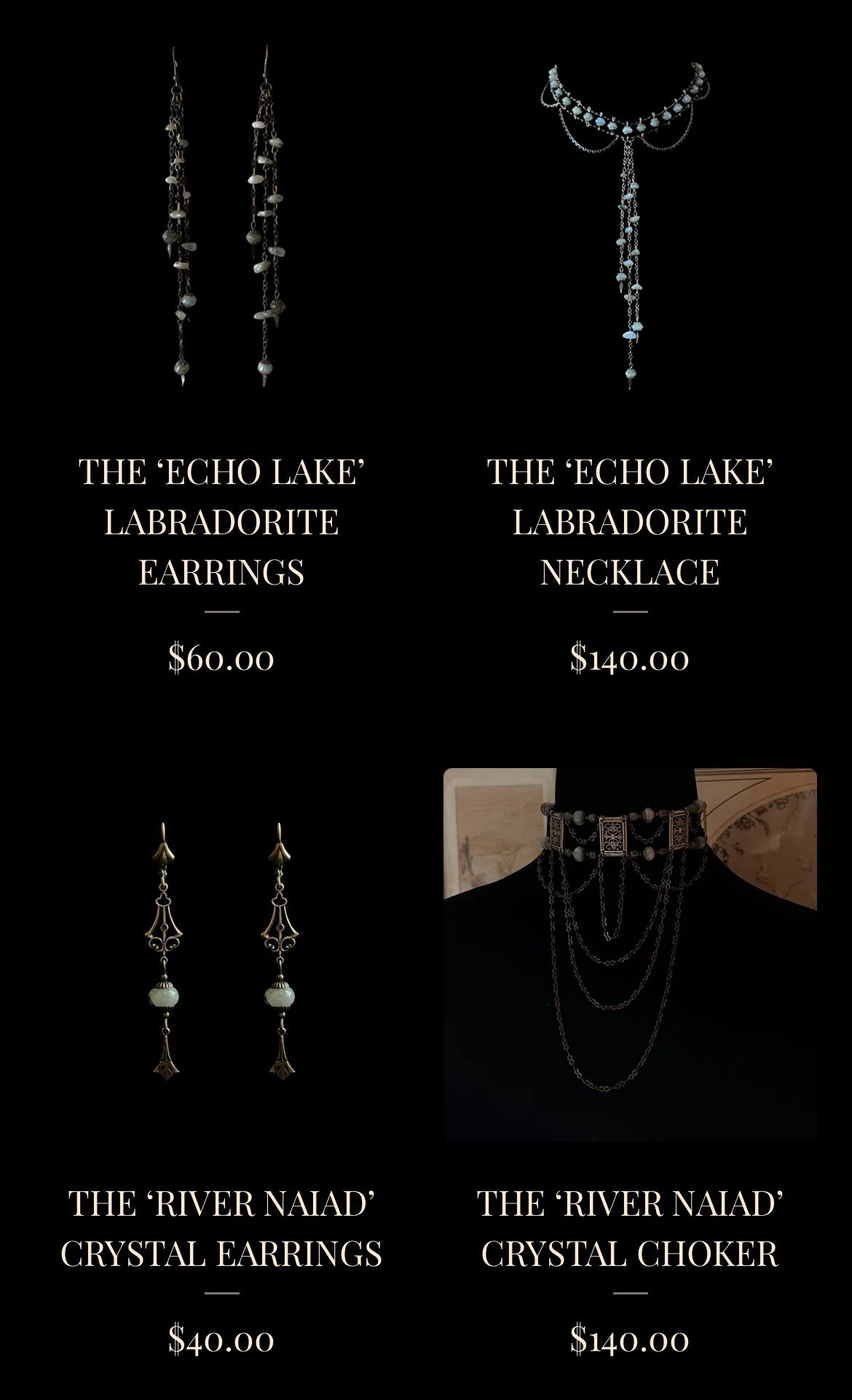 As of tonight, there are four available pieces from this collection, and six more to come! I will be trickling out the remaining pieces of the collection from now until the last day of summer, September 22nd. The four pieces that are currently available from this collection include the ‘River Naiad Crystal Choker & Earring Set’, and the, ‘Echo Lake Labradorite Necklace & Earring Set’…
