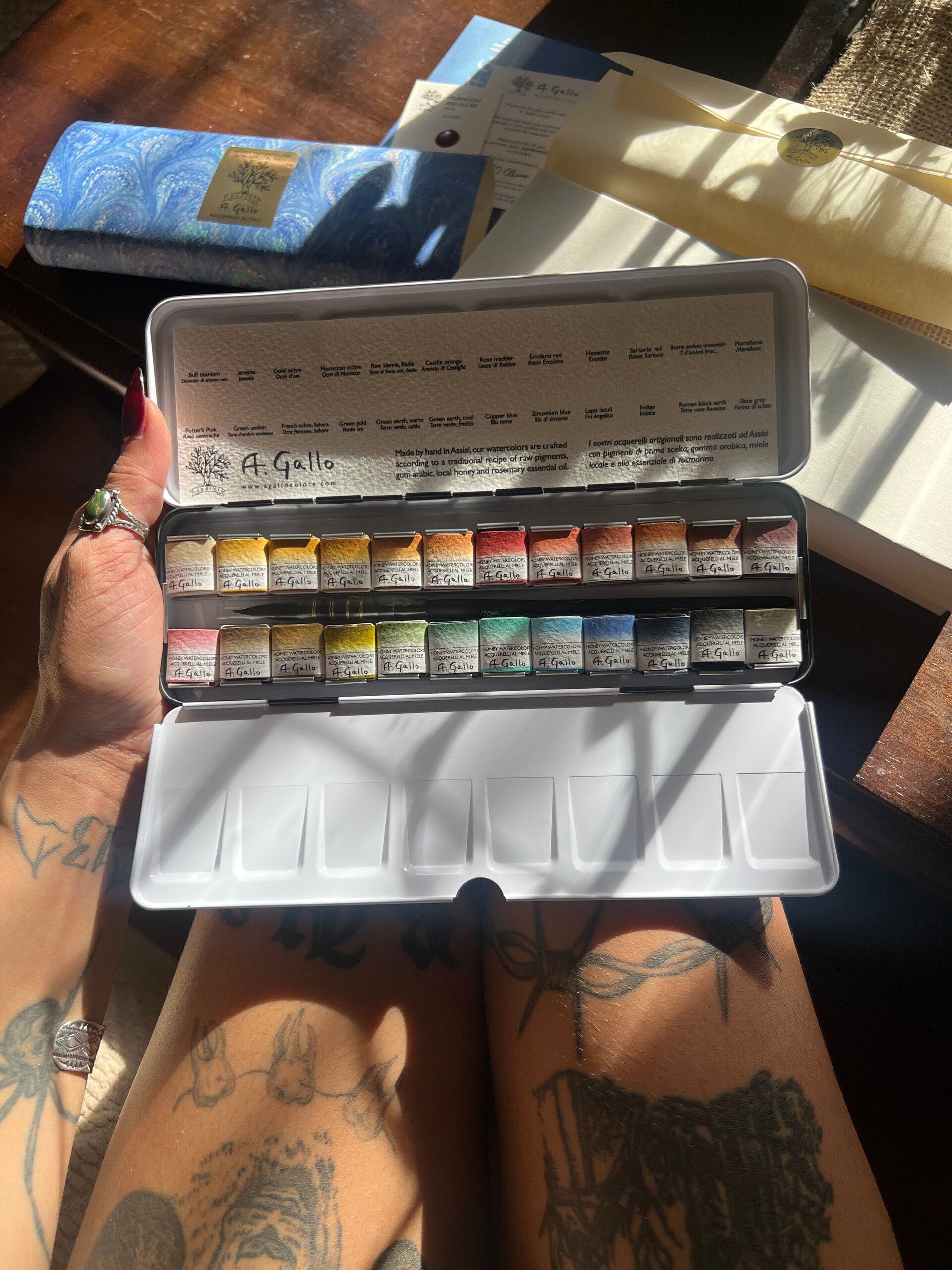 My partner recently surprised me with these gorgeous honey based watercolors by the company A. Gallo. They were intended to be a birthday gift but as some of you may know, I’m a virgo, and my birthday isn’t until the 15th, so you can imagine my surprise when he handed me these precious little paints in August!
