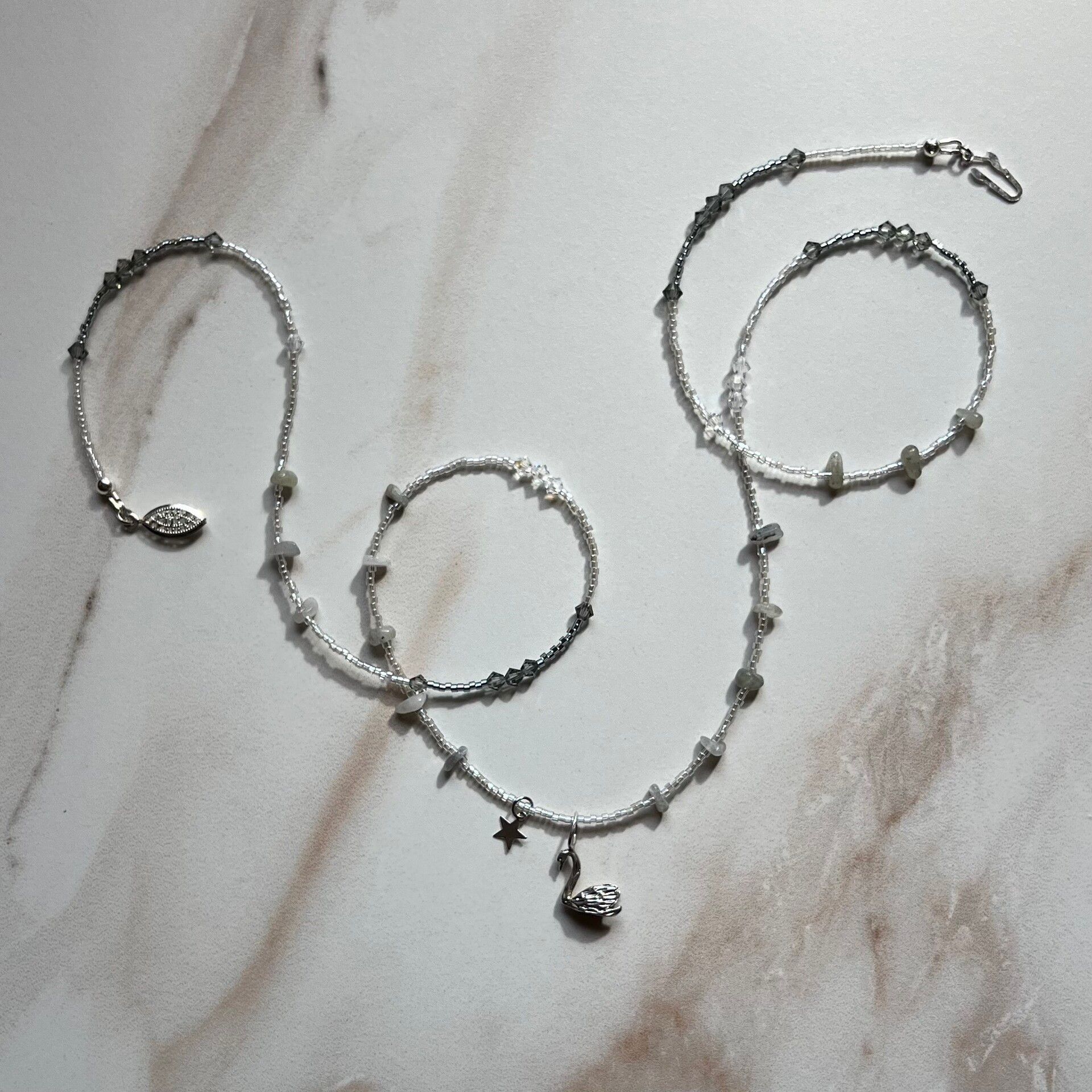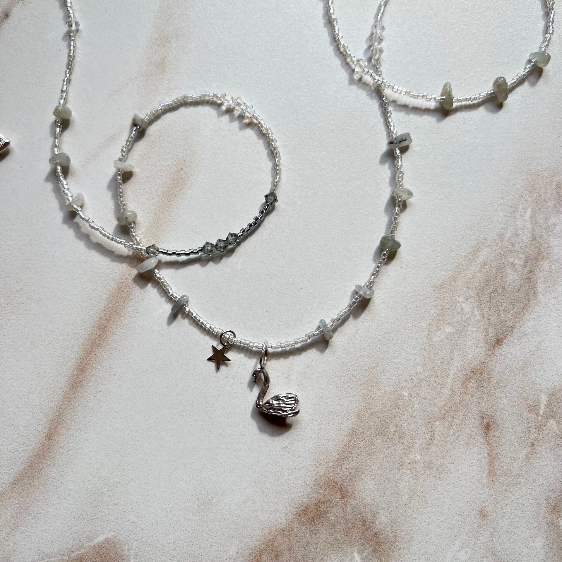 As for the âSwan Songâ Waist Adornment (Labradorite), this piece features an assortment of natural labradorite crystals, blue montana & clear preciosa crystals, glass seed beads, and a single sterling silver swan and star charm.