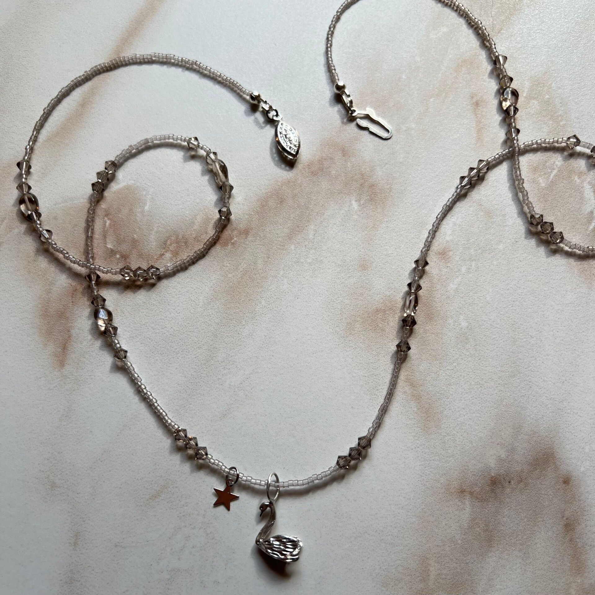 The âSwan Songâ Waist Adornment (Smoky Quartz) features natural smoky quartz crystals, grey preciosa crystals, glass seed beads, and a sterling silver swan focal charm sat next to a dainty silver star charm. áŻâ